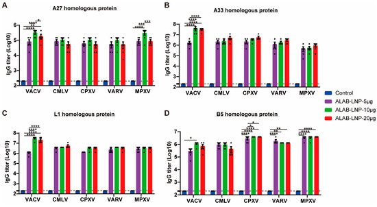 Cross-binding activity against homologous proteins of A27, A33, L1 and B5 of VACV, CMLV, CPXV, VARV, or MPXV, respectively. (A–D) Binding antibody titers in sera from ALAB-LNP immunized mice against homologous A27 (A), A33 (B), L1 (C), and B5 (D) proteins from VACV, CMLV, CPXV, VARV and MPXV, respectively, measured by ELISA; Summary data are shown as means ± SEM; The dashed line indicates the limit of detection (LOD); Statistical significance was assessed by two-way ANOVA with Tukey’s multiple comparisons test; p values were indicated by * (p < 0.05), ** (p < 0.01), *** (p < 0.001), or **** (p < 0.0001).