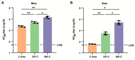 Neutralizing activity was complement-dependent in mice and rats. (A) Complement enhanced neutralizing activity in sera from mice; (B) Complement enhanced neutralizing activity in sera from rats; Summary data are shown as means ± SEM; The dashed line indicates the limit of detection (LOD); Statistical significance was assessed by unpaired t-test; p values were indicated by * (p < 0.05), ** (p < 0.01).
