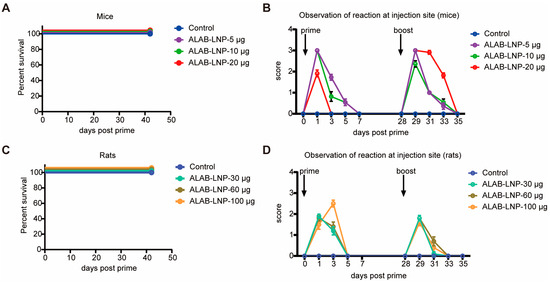 To evaluate the pre-clinical safety of the vaccine candidate, mice and rats immunized with ALAB-LNP were monitored for survival and side reactions including dropsy, swelling, stiffness, and immobility post-prime and boost-immunization. All mice and rats survived during the observation period from day 0 to day 42 post-primary-immunization (Figure 10A,C). After the primary immunization, rapid reactions were observed in both mice and rats on next day post-immunization and the reactions disappeared within 7 days in mice (Figure 10B). In rats, side reactions disappeared within 5 days post-prime-immunization (Figure 10D). Similar to priming, the boost immunization also caused a rapid onset of side reactions which diminished within 7 days for mice and 5 days for rats post-injection, respectively (Figure 10B,D). Of note, immobility was not found both in mice and rats during the course of the observation (Figure 10B,D), with the average highest reaction score being a short period of stiffness (approximately one day) followed by 3–4 days of swelling for mice and average highest reaction score being swelling (1–2 days) followed by dropsy for 2–3 days in the rat model. Overall, these data suggest a relatively safe mRNA vaccine candidate of ALAB-LNP in rodent models. A more stringent GLP study of pre-clinical safety of ALAB-LNP will be conducted in the future.