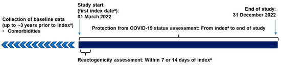 Data from individuals ≥12 years of age who received an NVX-CoV2373 primary series/booster in Germany between 1 March 2022 and 31 December 2022 were analyzed; the date of the NVX-CoV2373 vaccination was considered the index date (Figure 1).