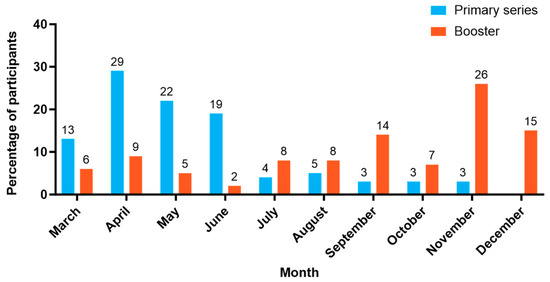 Multiple comorbidities were observed in individual recipients (≥1 comorbidity, 53%; ≥2 comorbidity, 30%; ≥3 comorbidity, 17%; Table 3). The most common baseline comorbidities were chronic neurological (36%) and chronic intestinal (21%) diseases. Recipients with chronic respiratory, cardiovascular, or metabolic disease each encompassed 10–11% of the total population; of those with a metabolic disease, the majority (66%) had diabetes. The frequency of several of the comorbidities, including recipients with multiple STIKO high-risk comorbidities, occurred in a higher proportion of recipients in the booster group than those in the primary series group. The most pronounced differences between the primary series group and the booster group were observed with neurological (29% vs. 47%) and cardiovascular (6% vs. 17%) diseases.