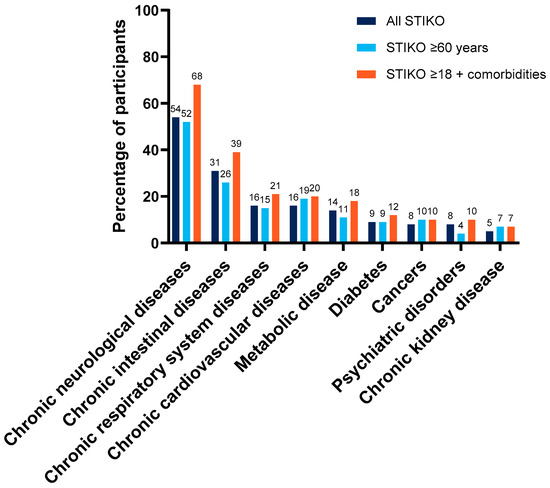 As with the total population, chronic neurological disease was the most common in the overall STIKO group (54%), STIKO ≥ 60 years (52%), and STIKO ≥ 18 + comorbidities (68%) groups (Figure 3). Chronic intestinal disease was the next most common comorbidity, occurring in 31%, 26%, and 39% of the overall STIKO, STIKO ≥ 60 years, and STIKO ≥ 18 + comorbidities groups, respectively. Recipients in the STIKO ≥ 18 + comorbidities group had higher or equal frequencies of comorbidities compared to the STIKO ≥ 60 years group. The largest differences between the STIKO ≥ 60 years versus the STIKO ≥ 18 + comorbidities groups were for neurological (52% vs. 68%), intestinal (26% vs. 39%), respiratory (15% vs. 21%), and metabolic (11% vs. 18%) diseases.