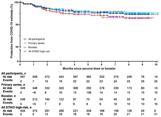 After a maximum follow-up of 10 months (median 7 months) after vaccination with NVX-CoV2373, protection from COVID-19 in the total population was estimated at 95% (95% CI, 93–97) (Figure 4). Protection from COVID-19 was similar among recipients of NVX-CoV2373 as part of the primary series (96% [95% CI, 0.94–0.98]) or a booster (93% [95% CI, 0.88–0.98]), and in those with a STIKO high-risk factor (94% [95% CI, 0.91–0.95]).