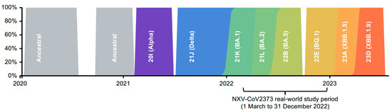 During this study, the major circulating strains were Omicron subvariants (Figure 5), a key point when considering the waning immunity to emerging variants [12]. This study was conducted while the Alpha, Delta, and early Omicron variants were in circulation and demonstrates the effectiveness of NVX-CoV2373 in a real-world population. The immune composition of the global population related to SARS-CoV-2 is continually evolving based on exposure to new variants/subvariants as well as the receipt of booster doses and updated vaccines. Real-world analyses such as this are informative during these times of dynamic evolution of SARS-CoV-2. Importantly, these analyses should be revisited as recommendations are released for vaccination against the most current circulating variants of interest/concern.