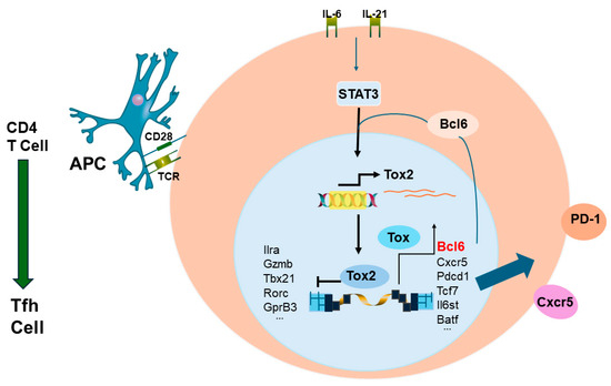 - Xu, W.; Zhao, X.; Wang, X.; Feng, H.; Gou, M.; Wang, X.; Liu, X.; Dong, C. The transcription factor Tox2 drives T follicular helper cell development via regulating chromatin accessibility. Immunity 2019, 53, 826–839. [Google Scholar] [CrossRef]