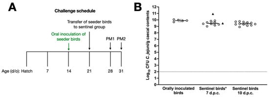 Validation of a model to mimic the natural transmission of C. jejuni between chickens. Panel (A) shows the schedule for oral gavage of seeder-birds with 105 C. jejuni NCTC 11168H, followed by the introduction of 2 seeder-birds into a group of 23 naïve sentinels. Caecal colonisation by C. jejuni NCTC 11168H in sentinel birds at 7 and 10 days after introduction of the seeder-birds is shown in panel (B), together with evidence that seeder-birds were reliably colonised. Days post-challenge are abbreviated to d.p.c. * Bacterial counts of seeder-birds are shown as triangles and were excluded from the statistical analysis.
