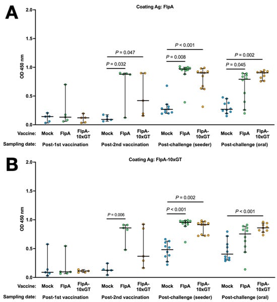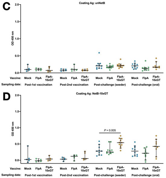 Quantification of antigen-specific Ig responses following vaccination and challenge by ELISA. The coating antigens used were unglycosylated FlpA (panel (A)), FlpA-10×GT (panel (B)), unglycosylated NetB (panel (C)), or NetB-10×GT (panel (D)). These were screened against 1:50 dilutions of serum from chickens that were mock vaccinated or vaccincated with FlpA or FlpA-10×GT, collected 14 days after the first vaccination on the day of hatch or 14 days after the second vaccination (day 28 of age). Serum was also analysed from birds 7 days after the C. jejuni challenge. The data are shown separately for birds that were challenged by oral gavage or by contact with seeder-birds. Significant differences between groups are indicated, and p values are indicated.