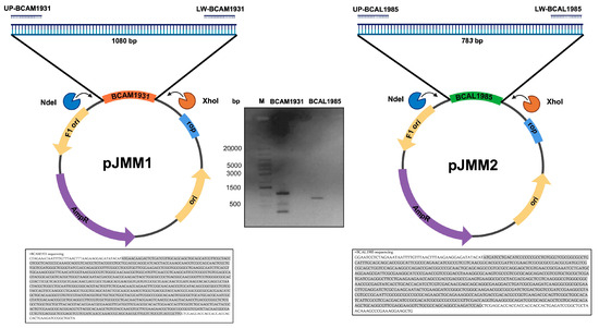 Schematic representation of the cloning of bcal1985 and bcam1931 genes in pET23a+, yielding the plasmids pJMM1 and pJMM2, respectively. In the middle, the agarose gel of the PCR products bcam1931 and bcam1985 is represented. M—Gene Ruler 1kb Plus DNA ladder (20,000–75 bp). The sequencing results from the pJMM1 and pJMM2 using the T7 promoter primer are represented in the bottom boxes.