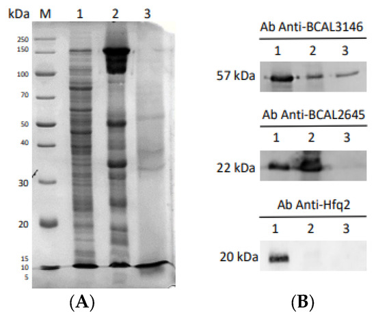 Extracellular, cytoplasmatic, and outer membrane proteins were separated using 12.5% SDS-PAGE. A Trans-Blot® SD (BIORAD, Hercules, CA, USA) device was used to transfer the proteins from the gel to NC membranes (PALL corporation). The membranes were then blocked overnight at 4 °C with 3% (w/v) Albumin (BSA) fraction V (PanReac AppliChem) in PBS 1×. The membrane was probed with the primary Goat antibody of interest, anti-HFQ2 (1:1500 dilution), anti-GroEL (1:3500 dilution), or anti-BCAL2645 [29] (1:4000 dilution) for 2 h at room temperature. Then, the secondary antibody HRP-conjugated Mouse anti-Goat IgG antibody diluted 1:10,000 (SANTA CRUZ biotechnology, Dallas, TX, USA) was added. After 1 h of incubation at room temperature, the membranes were treated with the peroxidase substrate ECL (Sigma, St. Louis, MO, USA). Chemiluminescence signals were detected using a FUSION Solo device (Vilber Lourmat, Collégien, France).
