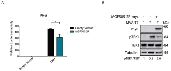 Ectopic expression of pMGF505-2R reduces IFN-β promoter activity and reduces TBK1 phosphorylation. (A) HEK/293T cells (120,000 cells) were transfected with pTBK1_Flag (50 ng), pCAGGS_IRES_MGF505-2Rmyc (1 µg), pIFNβ_Luc (50 ng), pRLTK (25 ng) and empty vector (to equal amount in ng) as indicated. At 24 h post-transfection (hpt), cells were lysed, and luciferase activity was analyzed using luciferase reporter assay after IFN-β promoter induction with pTBK1_Flag. The graph is representative of three different experiments. (B) BSRT7 cells were infected with MVA-T7, and 1 hpi cells were transfected with an empty vector or pIRES_MGF505-2R-myc vector (1000 ng). At 16 hpt, cells were lysed with RIPA. Phosphorylation status and total expression of proteins were analyzed with Western blot with anti-pTBK1, anti-TBK1-E8I3G, anti-tubulin, and anti-myc (MGF505-2R) antibodies. Data were statistically analyzed by using a Student’s t-test (* p < 0.05).