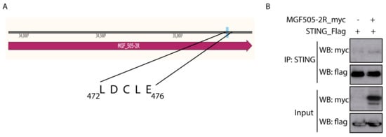 To perform the co-immunoprecipitation assay, COS-1 cells transfected for 24 h with STING-Flag and pCAGGS_IRES_MGF505-2R-myc were used. Figure 2B shows how, after immunoprecipitating STING, a band corresponding to pMGF505-2R is observed after revealing with anti-myc, suggesting that pMGF505-2R interacts with STING under these conditions.
