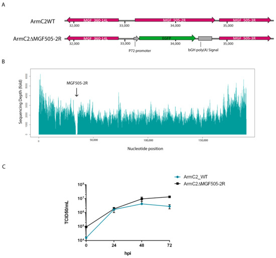The complete genome sequence of Arm/07-ΔMGF505-2R-GFP was analyzed using Illumina (MicrobesNG) from purified DNA obtained from extracellular viral particles [37], with a high average coverage of 4460×. As seen in Figure 3B, a complete drop in reads in the region of the genome corresponding to the MGF505-2R gene (33872 bp-35452 bp) was found, confirming the deletion of the MGF505-2R gene, and the absence of other deletions in any other region of the genome was also assessed.
