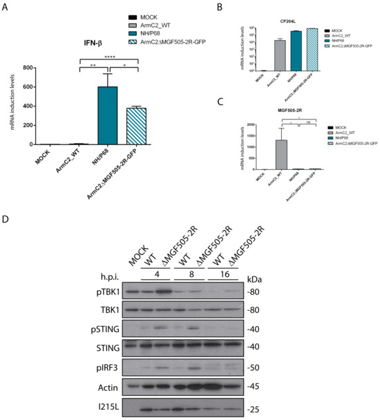 Altogether, our results indicate that the viral pMGF505-2R protein is involved in the modulation of the cGAS-STING signaling pathway and in the inhibition of IFN-β production, and consequently, the Arm/07-ΔMGF505-2R-GFP activates the innate immune response during infection.
