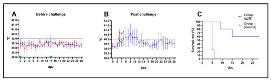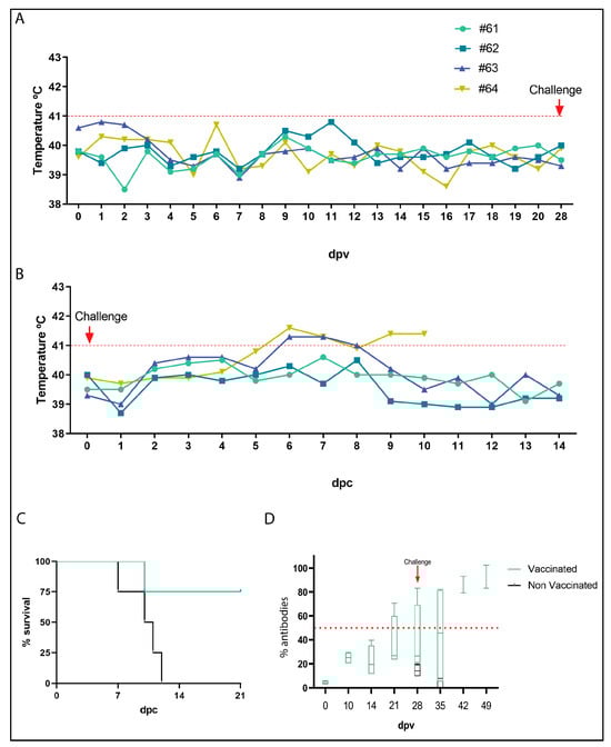 Evaluation of clinical signs was assessed on a daily basis beginning from 0 dpv to 56 dpv (28 dpc). Whole blood and serum samples were collected on the 0, 4, 7, 14, 21, and 28 dpv and then at 4, 7, 14, 21, and 28 dpc.