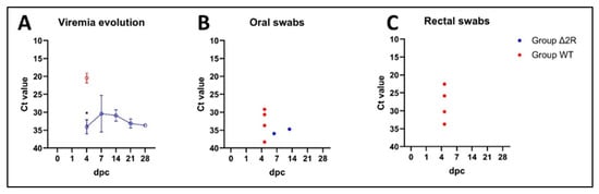 Viremia evolution and shedding pattern in swabs of control and vaccinated animals with Arm/07-ΔMGF505-2R-GFP. (A) Viremia evolution during the experiment (mean Ct values): initial virus load in the blood of vaccinated animals is significantly lower (p < 0.0001) than in the blood of WT group animals. Virus clearance tendency is noticeable between 7 and 28 dpc. (B) shedding pattern (individual values) in oral swabs. (C) shedding pattern (individual values) in rectal swabs. *—statistically significant, dpc—day post-challenge. Error bars indicate standard deviation.