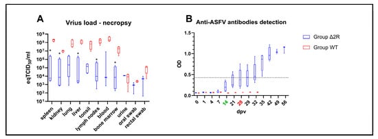 Virus load in tissues and antibodies detection from control or vaccinated animals with Arm/07-ΔMGF505-2R-GFP. (A) Virus load in internal organs and chosen samples collected during necropsy. (B) optical density values (OD) of anti-ASFV antibodies detection. The boxes represent the 50% between the 25 and 75% quartiles. The line inside the box indicates the median. The top and bottom lines denote maximum and minimum values. Dpv—days post-vaccination, green color—boost timepoint, red color—challenge timepoint, *—statistically significant, eq—equivalent, Black dashed line—mean negative cutoff threshold.
