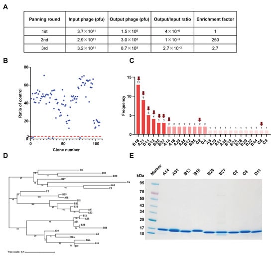 Identification of SARS-CoV-2 RBD-specific nanobodies. (A) Enrichment of phage particles binding to the RBD through three rounds of biopanning. (B) Phage ELISA for the identification of positive clones. A binding ratio higher than 3 compared to the negative control was considered positive. (C) According to the sequencing results, 26 unique nanobody sequences were identified, and the frequency of each sequence is displayed. The nanobodies indicated by the red arrow were chosen as candidates. (D) Phylogenetic tree showing the sequence diversity of 26 unique nanobodies. (E) The SDS–PAGE gel showing the sizes and purity of the nanobodies.