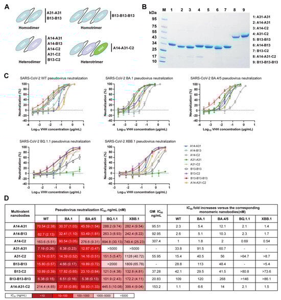 To assess the potential of multivalency in enhancing the neutralizing potency and breadth of A14, A31, B13, and C2 monomers, we designed nine multivalent nanobodies comprising homo- or heterodimeric nanobodies as well as homo- or heterotrimeric nanobodies (Figure 5A). These multivalent nanobodies were prepared by connecting two or three nanobody monomers through optimized flexible GlySer linkers of 20 amino acids [(G4S)4]. We found that they could be easily expressed in BL21 cells with purification yields of approximately 20–50 µg per milliliter in shake flask culture. SDS–PAGE analysis showed that the dimeric (≈30 kDa) and trimeric (≈45 kDa) nanobodies exhibited high levels of purity and had the expected molecular weights (Figure 5B).