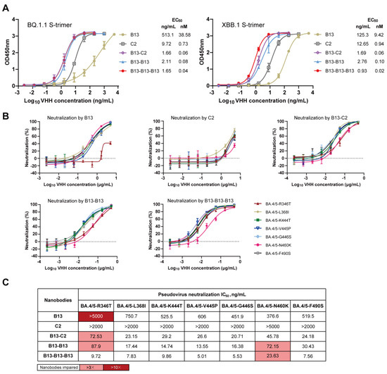 Recently, Yao et al. reported a homotrimer, Nb4-16t, that neutralizes multiple Omicron variants, including BQ.1 and XBB.1 [68]. However, Nb4-16t was engineered using a monomeric nanobody (Nb4) that specifically targets a conserved epitope, which differs from our design strategy. In our study, we selected the monomer B13, which targets a nonconserved epitope, to construct the homotrimer B13-B13-B13, which can also effectively neutralize Omicron BA.1, BA.4/5, BQ.1.1, and XBB.1 at low concentrations. More importantly, we also observed a similar effect when utilizing monomers B13 and C2 to engineer heterodimer B13-C2, despite the weak potency of C2 (IC50 > 2 µg/mL). To our knowledge, a heterodimer similar to B13-C2 with potent neutralizing activities against Omicron BQ.1.1 and XBB.1 has not been reported thus far. Most researchers prefer constructing multimers of potent neutralizing nanobodies that target conserved epitopes, which has also proven to be an effective strategy [55,68,69]. Our study demonstrated that even if nanobodies lose their neutralization activity against new SARS-CoV-2 variants due to the targeting of nonconserved epitopes, they may still be selected for developing multivalent nanobodies with enhanced potency and neutralization breadth. This finding could enhance researchers’ understanding of nanobody multimerization strategies, thereby transforming previously developed partial nanobodies into a formidable arsenal to help combat the pandemic.