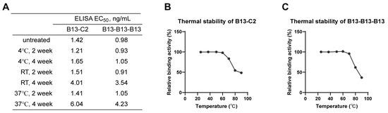 Among dimeric and trimeric nanobodies, B13-C2 and B13-B13-B13 exhibited the highest neutralizing activity, respectively. Therefore, we selected them as representative antibodies for further stability analyses. The in vitro stabilities of B13-C2 and B13-B13-B13 were assessed by storing them at different temperatures for either two or four weeks, followed by measuring their binding affinity towards the Omicron XBB.1 S-trimer protein using ELISA. As shown in Figure 7A, the binding capacity of both B13-C2 and B13-B13-B13 remained almost unchanged when stored at three different temperatures for up to 2 weeks. While being stored at room temperature or 37 °C for 4 weeks, their binding affinity showed slight degradation but remained within the single-digit ng/mL range. Furthermore, B13-C2 and B13-B13-B13 exhibited excellent thermal stability (Figure 7B,C). After incubation at 70 °C for 30 min, the relative binding activities of both B13-C2 and B13-B13-B13 remained above 90%. However, their relative binding activities significantly degraded after being incubated at 80 °C for 30 min, while still remaining above 50%. The above results demonstrate that our engineered multivalent nanobodies exhibit remarkable drug stability.