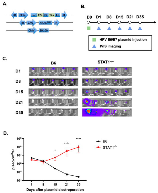 STAT1−/− mice promote tumorigenesis of HPV oral tumor model. (A) Schematic diagram of the three DNA plasmids encoding HPV16 E6/E7 with luciferase, Ras, and SB100 DNA used for tumor model. (B) Schematic diagram of the experimental procedure; 4–6-weeks-old C57BL/6NTac mice and STAT1−/− mice were injected with DNA plasmids encoding HPV16 E6/E7 with luciferase, Ras, and SB100 (10 μg/plasmid, 30 μL/injection per mouse) into the buccal mucosa, followed by electroporation. Tumor growth in mice was monitored via IVIS imaging weekly (n = 5). (C) Bioluminescence imaging of tumor-bearing mice using IVIS Spectrum after IP injection of luciferin solution (n = 5). (D) Line graph summarizing the bioluminescence imaging of the tumor growth over time (n = 5). All data are presented as the mean ± SEM (* p < 0.05; **** p < 0.0001).