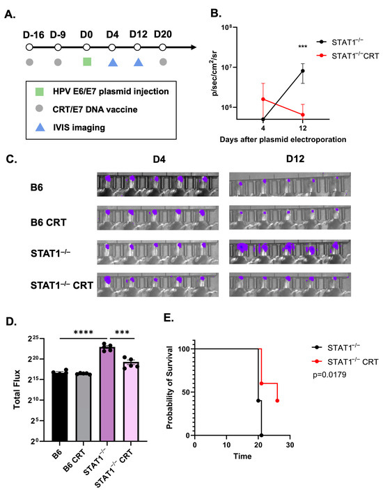 CRT/E7 vaccination showcased antitumor effect against spontaneous HPV tumors in STAT1−/− mice. Mice were administrated with HPV16 E6/E7 plasmid (10 ug) followed by electroporation as described. (A) Schematic of therapeutic HPV E6/E7 vaccination with CRT/E7 experiment design. (B) Line graph illustrating the total luciferase intensity of the tumor after CRT/E7 vaccination treatment (n = 5). (C) Individual bioluminescence imaging among each group after vaccine administration (n = 5). (D) Bioluminescence intensity comparison in each group at the end of treatment (n = 5). (E) Survival curve is presented in percentages (n = 5). All data are presented as the mean ± SEM (*** p < 0.001; **** p < 0.0001).