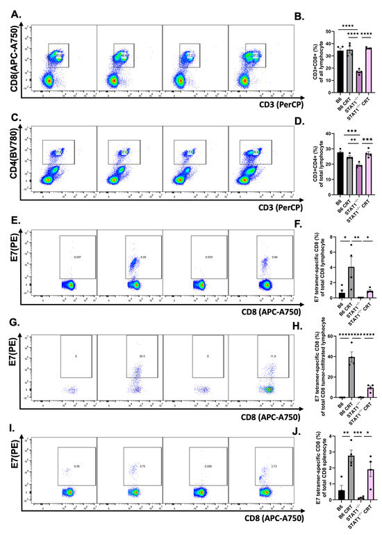 Given the controlled tumor response observed in STAT1−/− mice, it is critical to examine the immunological response elicited by CRT/E7. This assesses the immunocompetency of STAT1−/− mice. PBMCs were collected from tumor-bearing mice as described in the protocol, and T-cell populations were analyzed with flow cytometry. The vaccinated STAT1−/− mice exhibited significantly elevated CD8+ (Figure 3A,B) and CD4+ T-cell (Figure 3C,D) populations compared to unvaccinated STAT1−/− mice. Subpopulation analysis revealed a significant increase in E7-specific CD8+ T cells in STAT1−/− mice subjected to CRT/E7 vaccination compared to those without vaccination (Figure 3E,F). Tumors and spleens were also collected from tumor-bearing mice as described in the protocol to determine whether a similar trend existed in E7-specific tumor-infiltrating lymphocytes (TILs) and splenocytes. E7-specific CD8+ TILs were observed in significantly higher percentages in vaccinated STAT1−/− mice than those without vaccination (Figure 3G,H). E7-specific CD8+ TILs were also observed in significantly higher percentages in vaccinated STAT1−/− mice than those without vaccination (Figure 3I,J). Altogether, these findings indicate that effector T cells can be augmented in STAT1−/− mice through CRT/E7 vaccination.