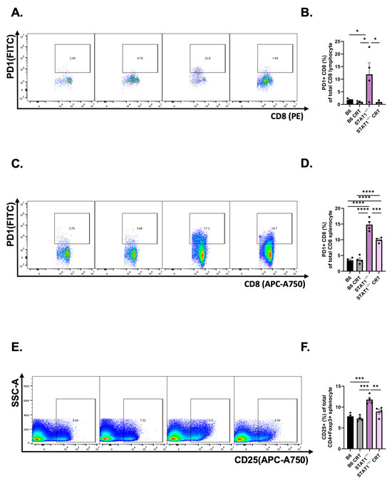 Our initial analysis of the immunological response against CRT-E7 showed that vaccinated STAT1−/− mice had significantly increased CD4+ and CD8+ T cells, and most importantly, the E7-specific CD8 T-cell population was also increased (Figure 3). Our previous studies in developing and testing CRT-E7 demonstrated its antitumor effect by significantly increasing E7-specific CD8+ T cells [43,44,45]. Therefore, the tumor control in STAT1−/− mice can be attributed to the E7-specific CD8+ T-cell population.