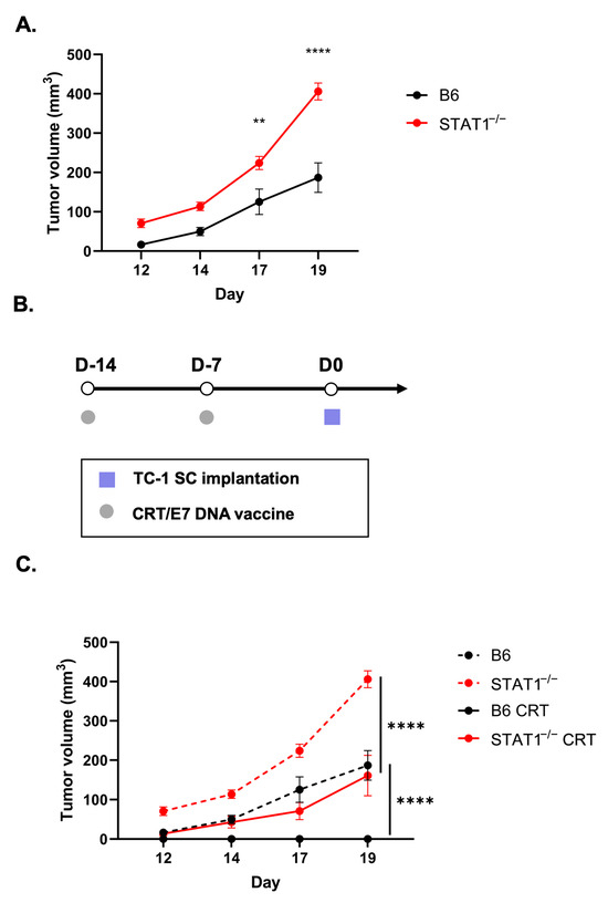 The above findings showcase STAT1−/− mice retaining some degree of immunocompetency when vaccinated with CRT/E7. In addition, we further challenged the control and STAT1−/− mice with direct tumor cell implantation to elucidate their retention of a responsive host immune system. Without CRT/E7 vaccination, TC-1-bearing STAT−/− mice showed a significantly more rapid tumor growth than control mice, nearly doubling the tumor volume of the control mice by day 19 (Figure 5A). To test the host immune response against tumor challenge, mice in the vaccination groups received two doses of the CRT/E7 DNA vaccine before undergoing TC-1 tumor cell implantation (Figure 5B). The tumor growth curve demonstrated that vaccinated STAT1−/− mice exhibited significantly slower tumor progression than the unvaccinated STAT1−/− mice (Figure 5C). There was no tumor growth in the vaccinated control mice, showing that CRT/E7 was able to fully protect this group (Figure 5C). In essence, this finding revealed that the host immune response in STAT1−/− mice is weaker than that of control mice. Nevertheless, while the vaccinated STAT1−/− mice did not resist tumor growth entirely, the host immune system in STAT1−/− mice remains responsive to CRT/E7 vaccination by significantly slowing down tumor progression. Once again, this underscores how deletion of STAT1 in mice allows them to stay responsive to CRT/E7 vaccination, although it does not facilitate full tumor growth protection like that in vaccinated control mice.