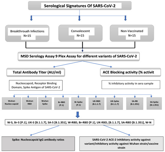 Study design followed for method applicability studies to establish serological signatures. Antigens in MSD assay is coded as follows: W-N, Wuhan Nucleocapsid; W-RBD, Wuhan receptor binding domain (RBD) protein; W-S, Wuhan Spike (S); Br-RBD [P.1], Brazil RBD; Br-S [P.1], Brazil S; UK-RBD [B.1.1.7], United Kingdom RBD; UK-S [B.1.1.7], United Kingdom S; SA-RBD [B.1.351], South Africa RBD; SA-S [B.1.351], South Africa S.