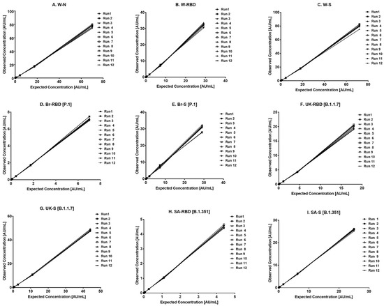 Standard curve range of the assay. (A–I) represents the assay range for the nine antigens. The X-axis represents the expected concentration (AU/mL) whereas the Y-axis represents the obtained concentration (AU/mL). Data are representative of 12 runs. Abbreviations: W-N, Wuhan Nucleocapsid; W-RBD, Wuhan receptor binding domain (RBD); W-S, Wuhan Spike (S); Br-RBD [P.1], Brazil RBD; Br-S [P.1], Brazil S; UK-RBD [B.1.1.7], United Kingdom RBD; UK-S [B.1.1.7], United Kingdom S; SA-RBD [B.1.351], South Africa RBD; SA-S [B.1.351], South Africa S.