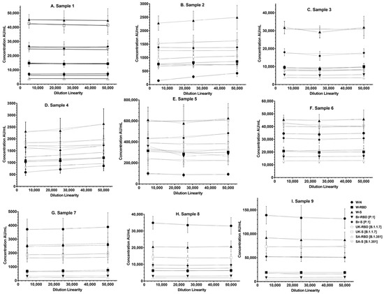 Dilution linearity of the assay. (A–F) represent dilution linearity graphs observed for infected sera samples. (G–I) represent dilution linearity data for NIBSC samples. The X-axis represents the sample’s dilutions, and the Y-axis represents the concentration observed in (AU/mL). The dotted line in the figure represents the 95% confidence interval. Abbreviations: W-N, Wuhan Nucleocapsid; W-RBD, Wuhan receptor binding domain (RBD); W-S, Wuhan Spike (S); Br-RBD [P.1], Brazil RBD; Br-S [P.1], Brazil S; UK-RBD [B.1.1.7], United Kingdom RBD; UK-S [B.1.1.7], United Kingdom S; SA-RBD [B.1.351], South Africa RBD; SA-S [B.1.351], South Africa S.