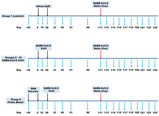 The experiments reported herein were conducted in compliance with the Animal Welfare Act and in accordance with the principles set forth in the Guide for the Care and Use of Laboratory Animals, National Research Council, National Academy Press, 1996. The study protocol (#A20-141) was reviewed and approved by the Wake Forest University Institutional Animal Care and Use Committee (IACUC) and the U.S. Navy Bureau of Medicine and Surgery (BUMED) in compliance with all the applicable federal regulations governing the protection of animals and research. The SARS-CoV-2 PsIV alone and in a prime-boost regimen, using two doses of the DNA vaccine followed by boosting with the SARS-CoV-2 PsIV, was evaluated for its immunogenicity in NHPs (Cynomolgus macaques), as shown in Table 1. Five groups of 8 animals each were immunized with two doses of different amounts of the SARS-CoV-2 PsIV with 10 mg of the Advax-CpG adjuvant on days 0 and 30. The animals in group 1 (control group) received the Advax-CpG adjuvant in PBS on days 0 and 30. The animals in groups 2–5 received different amounts of the SARS-CoV-2 PsIV (0.0075–3.75 µg of spike protein equivalent per dose) with the Advax-CpG adjuvant on days 0 and 30. The animals in group 6 (prime-boost group) received the DNA vaccine on days −30 and 0, followed by a boost with the SARS-CoV-2 PsIV (3.75 µg spike protein equivalent) on day 30. The SARS-CoV-2 PsIVs were administered via intramuscular injection (IM) using a PharmaJet Stratis needle-less injector. The DNA vaccine (encoding the SARS-CoV-2 spike protein) was administered via the IM route using the Ichor electroporation device. Blood was collected from all the animals on days −30, 0, 30, 51, 90 and 120, and the serum preparations were tested for the presence of neutralizing antibodies against SARS-CoV-2 using the microneutralization assays. Blood was also drawn from all the animals and processed to obtain their PBMCs on day −30 (baseline PBMCs) and on day 45 (15 days after the last dose of the vaccine) (Figure 1).