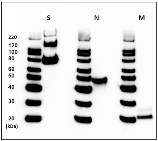 Western blot analysis of SARS-CoV-2 PsIV after two-step chromatographic purification using Cellufine MAX-DexS-VirS column and a Capto Core 700 column. Presence of SARS-CoV-2 spike glycoprotein (S), nucleocapsid protein (N) and membrane protein (M) was confirmed by binding to the respective antibodies. Intensities of S, N and M bands relative to the 80 KDa molecular weight marker intensity are provided in the Supplementary Materials.