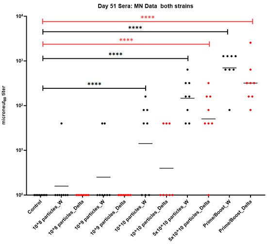 Five groups each containing eight NHPs (Cynomolgus macaques) were immunized with PBS (control group) or 0.0075 µg–3.75 µg of spike protein per dose (equivalent to 108–5 × 1010 particles per dose) of the SARS-CoV-2 PsIVs formulated with the Advax-CpG adjuvant on days 0 and 30, as shown in Table 1. A sixth group of eight animals (Prime-boost group) was vaccinated with two doses of the DNA vaccine encoding the SARS-CoV-2 spike protein on days −30 and 0 followed by a third dose of the SARS-CoV-2 PsIV (5 × 1010 particles per dose) on day 30. Their blood was collected on day −30 (only the prime-boost group) and from all animals on days 0, 30, 35 and 51. Their serum was tested for the neutralization of the SARS-CoV-2 Washington strain and the Delta variant using microneutralization assays. All the microneutralization data are reported as MN80 titers, reflecting an 80% reduction in the infection of the cells in vitro when compared to the level of infection in the absence of neutralizing antibodies. The MN80 data for the day 51 sera (three weeks after the administration of the last dose) are shown in Figure 3.
