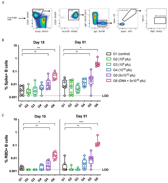 To generate the protein probes, the recombinant WA-1 S-2P and RBD proteins were biotinylated using the EZ-Link Micro Sulfo-NHS-LC Biotinylation Kit (Thermo Fisher Scientific, Waltham, MA, USA) according to the manufacturer’s instructions [20]. Streptavidin-conjugated fluorophores (SA-PE, SA-APC or SA-BV421) and biotinylated proteins were coupled at a 4:1 molar ratio. The cryopreserved PBMCs were thawed and stained with 100 ng of the fluorescent protein probes for 20 min at 4 °C, followed by staining with 7-aminoactinomycin D (7-AAD, Thermo Fisher, Waltham, MA, USA) and a panel of antibodies, IgM PerCP-Cy5.5 (G20-127, BD, Franklin Lakes, NJ, USA), IgD FITC (polyclonal, Southern Biotech, Birmingham, AL, USA), CD3 BV510 (SP34-2, BD), CD14 BV510 (M5E2, BioLegend, San Diego, CA, USA), CD16 BV510 (3G8, BD), CD20 BV605 (2H7, BioLegend, San Diego, CA, USA), HLA-DR BV650 (L243, BioLegend, San Diego, CA, USA) and IgG BV786 (G18-145, BD, Franklin Lakes, NJ, USA), for another 20 min at 4 °C. After staining, the cells were washed with FACS buffer (PBS supplemented with 2% heat-inactivated fetal calf serum) and fixed with 1% formaldehyde solution. The samples were acquired using a BD LSRFortessa cell analyzer (BD, Franklin Lakes, NJ, USA). The data were analyzed using FlowJo software v.10.7.1 (FlowJo, Ashland, OR, USA).