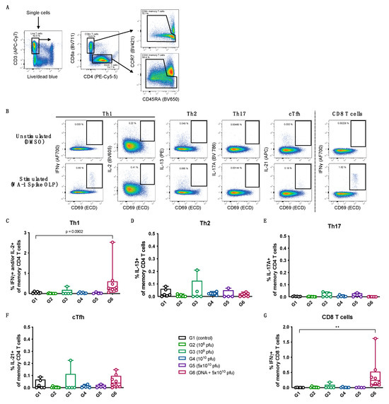 Memory T cell recall assay. (A) Gating strategy to define CD4 and CD8 memory T cells. (B) Example of T cell responses in response to no stimulation (DMSO) or stimulation with WA-1 spike-derived overlapping peptide (OLP) library using PBMCs collected 7 days after administration of the second dose (day 37). A sample from a group 6 animal is presented. Percentage of spike-specific Th1 (C), Th2 (D), Th17 (E), circulating Tfh (F) CD4 memory T cells and CD8 memory T cells (G) 7 days after administration of the second dose (day 37). All data are background-subtracted using unstimulated condition (DMSO). Statistical comparison between groups was performed using Kruskal–Wallis test. p-values were adjusted for multiple testing using Dunn’s multiple comparison test. ** p ≤ 0.01.