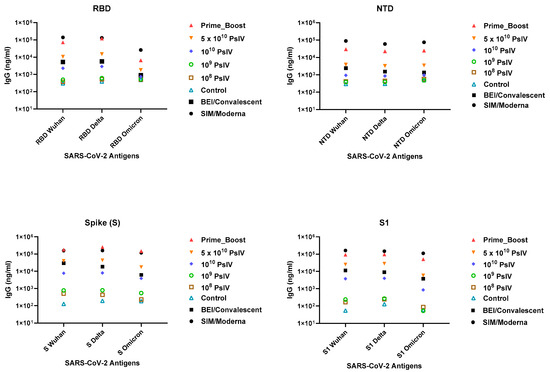The serum IgG titers against various spike protein domains (RBD, N-terminal and S1 domains) of the SARS-CoV-2 Wuhan, Delta and Omicron strains were measured (Figure 7). Consistent with the observed neutralizing antibody levels, a dose-dependent increase in the IgG levels against various spike protein domains of different variants were observed. Interestingly, the antibody levels elicited by the prime-boost group and the highest PsIV dose were higher than the antibody levels elicited by the reference convalescent sera obtained from BEI. These data suggest that the SARS-CoV-2 PsIV is highly immunogenic and elicits a dose-dependent neutralizing antibody response, while the heterologous prime-boost regimen of two doses of a DNA vaccine and a booster dose of the SARS-CoV-2 PsIV elicited the highest neutralizing antibody levels.