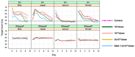 SARS-CoV-2 RNA copy numbers of 104–108 per mL in the BAL samples of the control animals were observed on days 1–9 after the challenge (BAL samples were not collected after day 9). RNA copy numbers of 104–106 per mL were also observed in the BAL samples from the animals in the prime-boost group on days 2 and 3 after the challenge but dropped to below 104 copies per mL by day 5 after the challenge and were undetectable after that. The BAL samples from the animals vaccinated with 5 × 1010 particles of the PsIV showed a marked reduction in their SARS-CoV-2 RNA copy numbers 6–9 days after the challenge, although it was not as pronounced as the reduction observed in the prime-boost-vaccinated animals. These results suggest that the heterologous prime-boost vaccination regimen protected the animals from SARS-CoV-2 infection, and a dose-dependent protection against infection was observed for the PsIV. Similar results were observed for the nasal and throat swab samples, as discussed below. The peak SARS-CoV-2 RNA copy number values for the throat swab samples from the prime-boost group were observed on day 1 and dropped significantly within 3 days after the challenge (below 103 copies per mL). Similarly, the nasal swab RNA copy numbers for the prime-boost animals peaked on day 2–3 after the challenge and dropped to values below 103 copies per mL by day 7 after the challenge. The throat swab RNA copy numbers for the animals in group 5 (5 × 1010 particles of PsIV) were observed on day 2–3 and dropped significantly within 6 days after the challenge (below 103 copies per mL). Similarly, the nasal swab RNA copy numbers for the animals in group 5 (5 × 1010 particles of PsIV) peaked on day 3 post-challenge and dropped to values below 104 copies per mL by day 8.