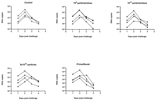 RNA copy numbers in nasal swab samples collected after the challenge with SARS-CoV-2 Delta strain using digital droplet RT-PCR (average of triplicate values for each RT-ddPCR reaction is shown here).