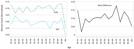 Mean normalized IPIP and ECRC altruism scores (left panel) and mean difference of ECRC–IPIP normalized scores (right panel) per 5-year age groups.