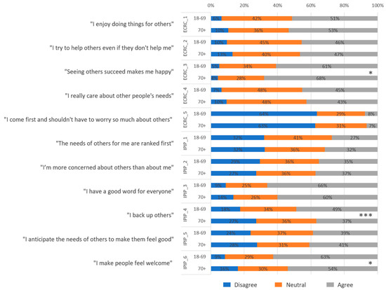 Age-related differences in agreement with altruism statements of ECRC and IPIP scales. For the 6-point Likert responses of the ECRC altruism scale, ‘strongly disagree’ and ‘disagree’ were grouped into a consolidated “Disagree” category, while ‘agree’ and ‘strongly agree’ were combined into an “Agree” category. The mid-range responses, ‘slightly disagree’ and ‘slightly agree’, were unified under the label “Neutral”. Similarly, for the IPIP’s 5-point scale, the ‘strongly disagree’ and ‘disagree’ responses were categorized as “Disagree”, and ‘agree’ and ‘strongly agree’ were labeled as “Agree”. The neutral midpoint remained as “Neutral”. Mann–Whitney U tests, * p < 0.05, *** p < 0.001.