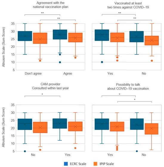 Impact of health behaviors and communication on altruism scores by scale type for the age group 18–69. Mann–Whitney U tests, * p < 0.05, ** p < 0.01.