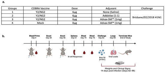 (a) Mice were randomly divided into four groups, with n = 18 mice in each group, and immunized intramuscularly (IM) with 3 μg of each COBRA HA proteins, Y2, and NG2 (total 6 μg), alone or formulated with AddaVax SE adjuvant at a 1:1 ratio or 1 mg Advax-SM™. As controls, a group of mice were immunized with 1 mg Advax-SM™ adjuvant only without antigen. (b) Schematic of study timeline. Mice were bled and prime-vaccinated on day 0 and boosted on days 28 and 56. On day 61, three mice from each group were sacrificed and spleens harvested for B cell FluoroSpot assays. Bleeds on remaining mice were performed on days 70 and 76, and an intranasal virus challenge was performed on day 82. Three days post-infection (day 85), lungs were harvested from three mice per group for lung viral titers and pathology, and the remaining mice were monitored for clinical illness and mortality for 14 days post infection.