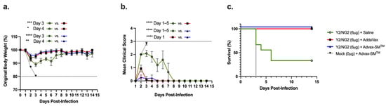 Mice were all challenged intranasally (IN) with the H1N1 strain, A/Brisbane/02/2018 (8 × 106 PFU/50 μL), and observed for 14 days post-infection. (a) Percent of original body weight loss, (b) clinical scores, and (c) percent survival. The dotted line in (a) represents the 20% weight loss endpoint cutoff. The dotted line in (b) represents a mean clinical score of 3. Each line (a,b) is conveyed as the average +/− standard error of the mean (SEM). p < 0.05 *, p < 0.01 **, p < 0.001 ***, p < 0.0001 ****.