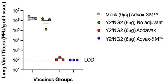 Lung viral titers of mice three days following challenge with A/Brisbane/02/2018. The Y-axis represents the day 3 post-challenge lung viral titers (PFU/g of tissue) and the X-axis represents the vaccine groups. Advax-SM™ alone control (Grey symbols), COBRA HA alone (Green symbols), COBRA HA plus Advax-SM™ (Blue symbols), COBRA HA plus SE adjuvant (Red symbols). The dotted line represents the limit of detection (LOD).