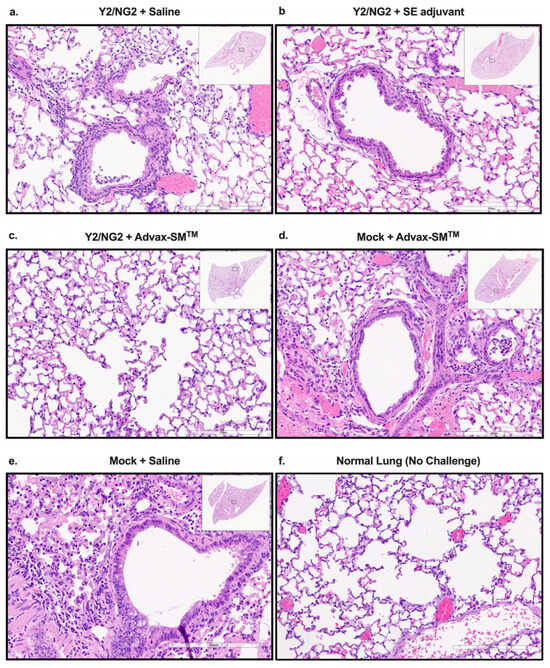 Histopathology of mice lung tissue harvested at three days post-infection with H1N1 Brisbane/02/18 influenza virus. The mice were humanely euthanized and their left lungs were infused with 10% formalin for fixing the tissue. Hematoxylin and Eosin (H&E) staining on lung slices measuring 5 µm was used to visualize pathology in the lungs. The lungs are represented at 20× magnification—the lower bar represents 200 um scale. COBRA HA plus (a) saline, (b) SE adjuvant, or (c) Advax-SMTM. Saline plus (d) Advax-SMTM, Mock plus (e) saline, or (f) uninfected.