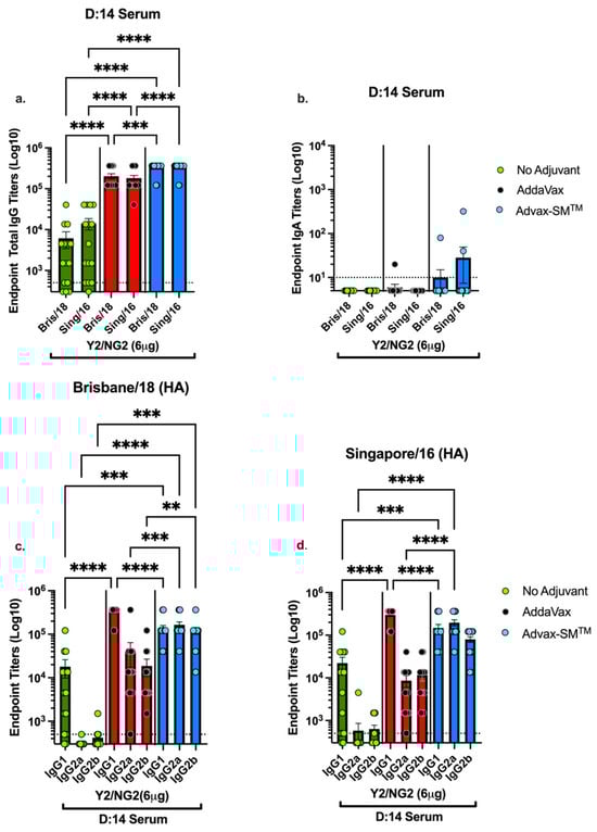 Serum anti-influenza total IgG, IgA and IgG1, IgG2a, and IgG2b in vaccinated mice. (a) Serum anti-influenza total IgG against Bris/02/18 and Sing/16 rHA, (b) serum IgA against WT Bris/18 and Sing/16 rHA, (c) serum IgG isotype titers against WT Bris/18, and (d) serum IgG isotype titers against Sing/16 rHA. Represented on the Y-axis are the endpoint titers. Represented on the X-axis are the WT rHAs (a,b) or the Ig isotypes (c,d). Each bar corresponds to 15 individual mice according to vaccine regimens and are conveyed as the average +/− standard error of the mean (SEM). p < 0.01 **, p < 0.001 ***, p < 0.0001 ****.