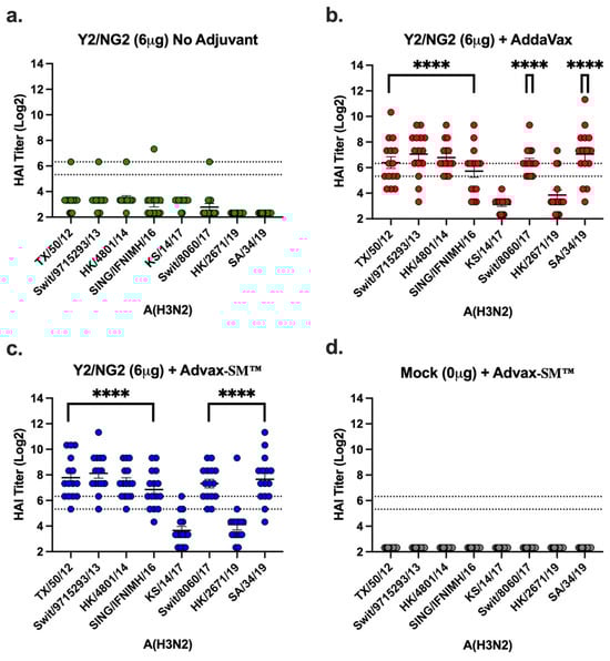 Hemagglutinin inhibition responses in mice immunized with COBRA HA antigens (Y2 and NG2). (a–c) Sera collected from immunized mice at days 70 and 76 were pooled (3 weeks post the third vaccination) and tested against two H3N2 influenza viruses. (a) Advax-SM™ alone controls, (b) COBRA HA + SE adjuvant (1:1), (c) COBRA HA + Advax-SM™, or (d) Mock + Advax-SM™. Represented on the Y-axis are the HAI titers on a log 2 scale. Represented on the X-axis is the panel of H3N2 influenza viruses. The top dotted line indicates a 1:80 HAI titer and the bottom dotted line indicates a 1:40 HAI titer. Statistical differences shown are of group (a) compared to group (b) or (c). Each column represents 15 individual mice pertaining to each vaccine regimen and are conveyed as the average +/− standard error of the mean (SEM). p < 0.0001 ****.