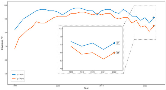 Following the establishment of national immunization programs in the 1970s, countries in Latin America and the Caribbean (LAC) have made marked improvements in the control of vaccine-preventable diseases (VPDs) [1,2]. Over the last decade, however, third-dose coverage of diphtheria–pertussis–tetanus-containing vaccine (DTPcv3) has declined from 93% in 2010 to 84% in 2019, with rising numbers of children with incomplete schedules and those who have not received any doses (“zero-dose” children) (Figure 1) [1,3]. Decreases in DTPcv1 and DTPcv3 coverages have also been observed in other routine vaccines; in an analysis of coverage trends from 2015 to 2019, Plans-Rubió found that 10 out of 13 vaccines in the Americas decreased during this period [4]. Coverage declines have been pronounced among children living in poverty and other vulnerable situations, as well as those in hard-to-reach areas [5,6].